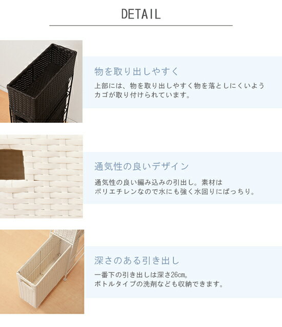 [ランドリーチェスト ワイド] 幅70cm 引出し5杯 幅70cm 引出し7杯 [キャスター付きランドリーチェスト] 幅30cm 幅40cm 幅50cm 幅60cm [隙間収納ランドリーチェスト] 3段幅15cm 3段幅20cm 4段幅15cm 4段幅20cm 通気性の良い引き出しで水回りの収納もバッチリ! 隙間収納で無駄なくすっきりスペースを有効活用 洗濯機の横や洗面台の横などのスペースに16cmの隙間があればチェストをおくことができます。