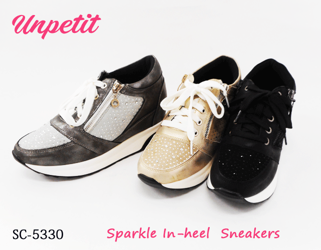 【SALE】Unpetit インヒール スニーカー 厚底 キラキラ ダイヤ スタッズ クッション 柔らかい ファスナー S M L LL レディース SC5330 ブラック グレー ベージュ
